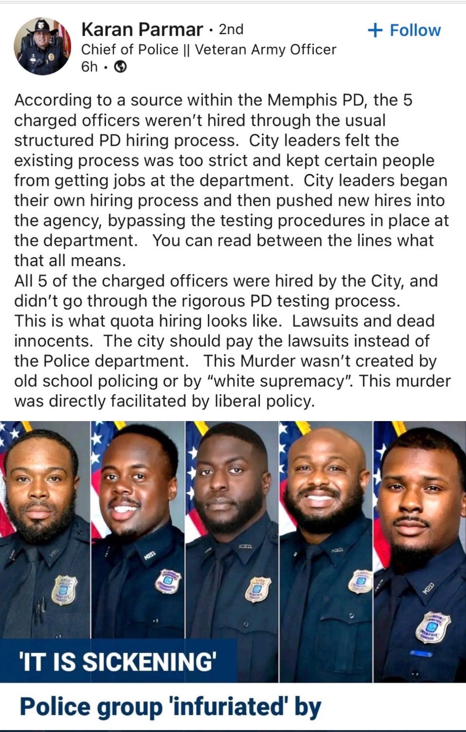 Let’s look at the first argument. The two most common sources for it are the aforementioned New York Post article and the LinkedIn post. Here’s the gist of the Post piece, which ran under the headline, “Memphis cops charged in Tyre Nichols murder hired after PD relaxed job requirements.”