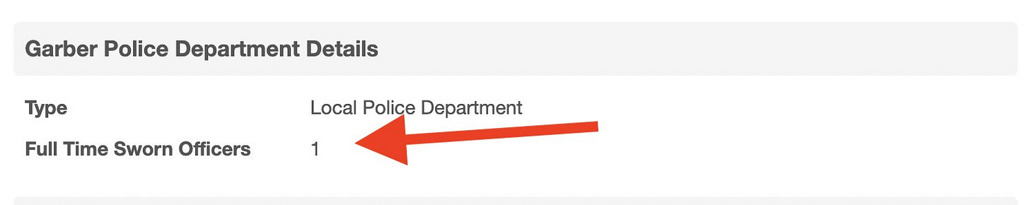 I found it odd that Parmar calls himself a police chief, but doesn’t actually name the town where he’s chief. So I looked it up. The town is Garber, Oklahoma. It has a population of about 800. And while Parmar may be the department’s “chief,” he also appears to be its only full-time employee: